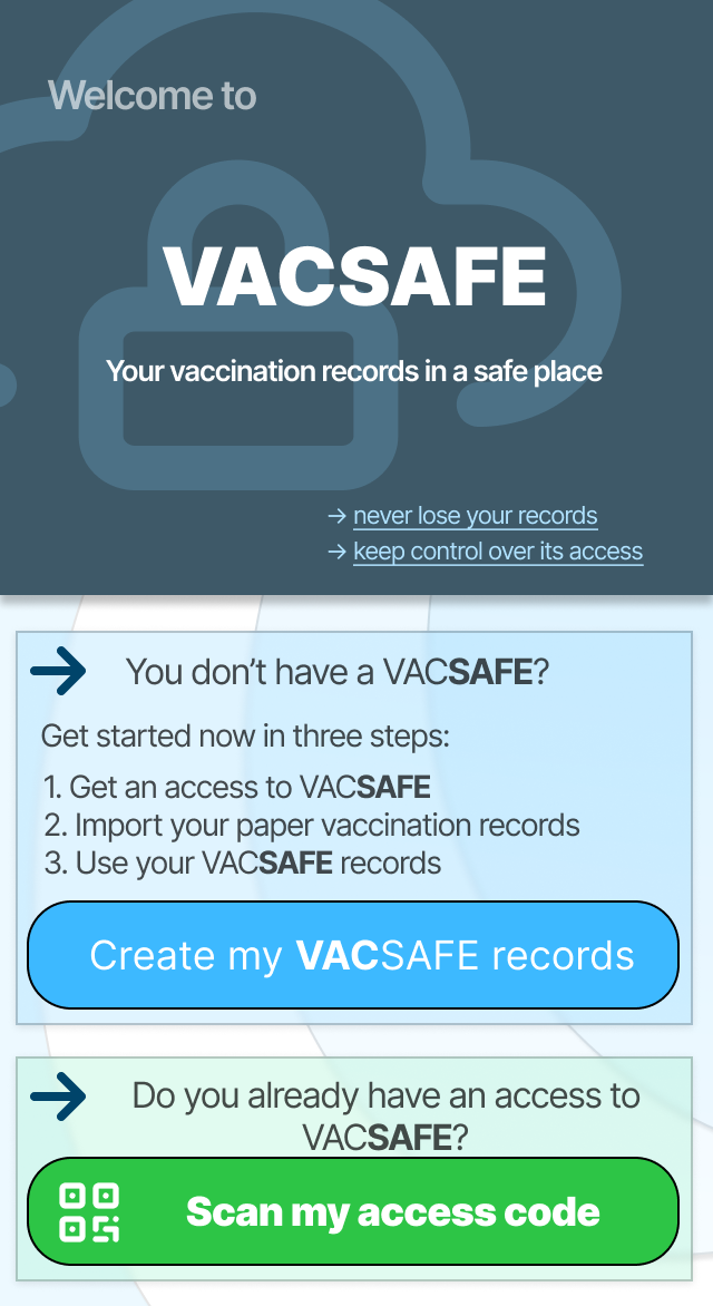 The VACSAFE project is an online digital alternative to the paper vaccination record. It aims to solve the inherent problems of this format, such as document loss, and offers the patient new features like sharing records or tracking their vaccinations in line with the recommended vaccination schedule.