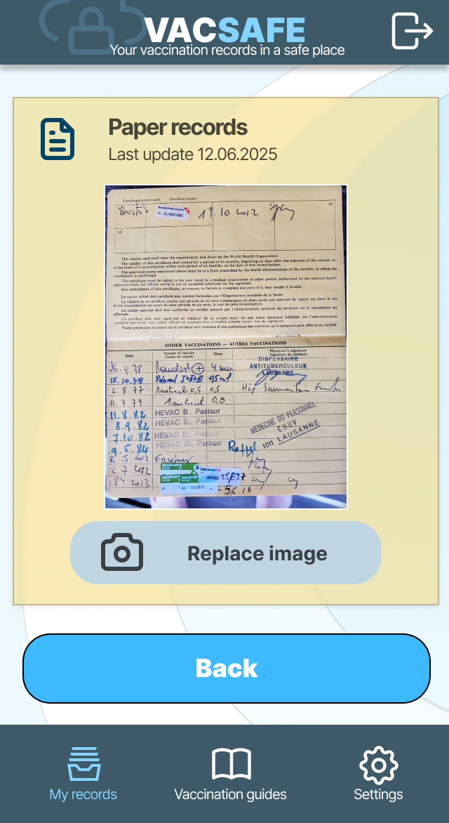 Possible extension: The image of the vaccination record can be analyzed by AI to automatically extract all the vaccination entries present.