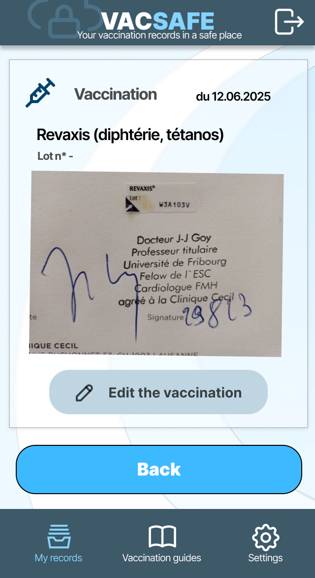 The patient can verify the data with the help of the doctor before saving their new vaccination.
