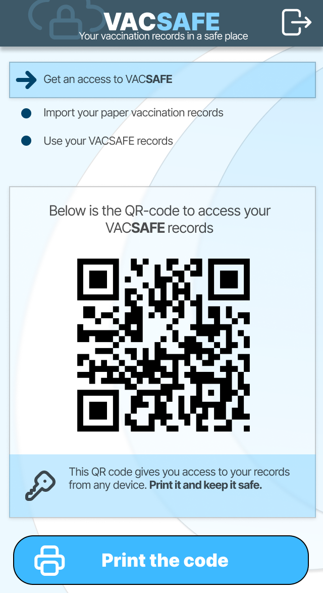 When the patient chooses "Start," a Vacsafe record is automatically created. An access QR code is generated. It guarantees the patient permanent access to their Vacsafe record even if they change phones. The QR code can be printed and kept in a safe place. It can also be given to their doctor to be kept in their medical file.